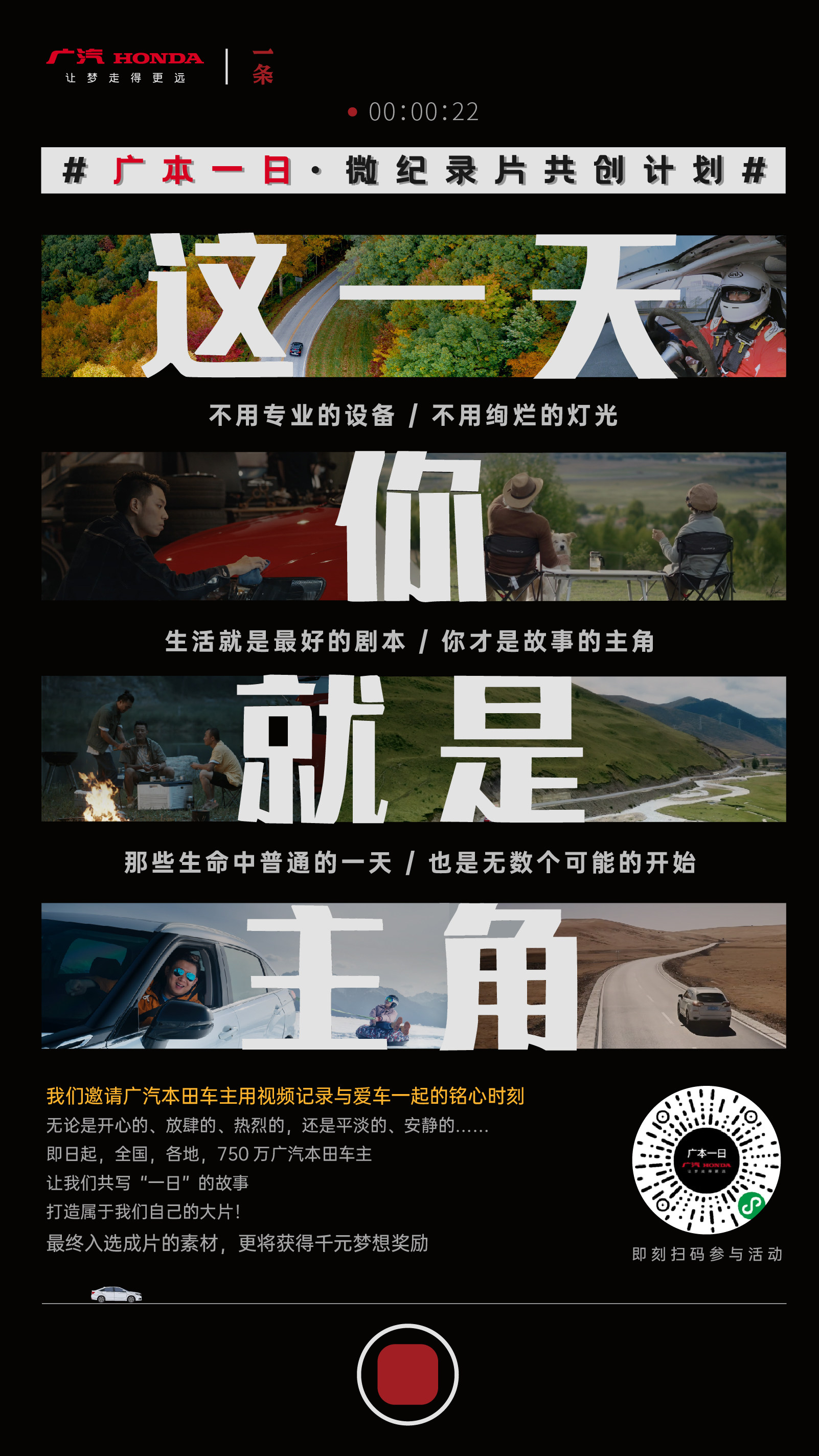 用心发掘车主故事,陪伴并鼓励他们勇敢追梦、分享精彩生活,2020年,广汽本田面向全国车主启动了“广本一日”微纪录片共创计划,征集车主和粉丝共创“一日”的故事,激励他们展现生活精彩的一面;这个活动以“这一天,你就是主角”为主题,让广汽本田车主成为故事主角。没有预设的脚本,车主和粉丝既是编剧、导演,同时也是故事主角。广汽本田作为组织者,让车主自发拍摄生活的点滴,以最真实的镜头展现出他们最真实的生活和梦想。积极@每一位敢梦人,广汽本田以汽车为媒介,与他们产生更多情感共鸣,逐梦更精彩的人生。