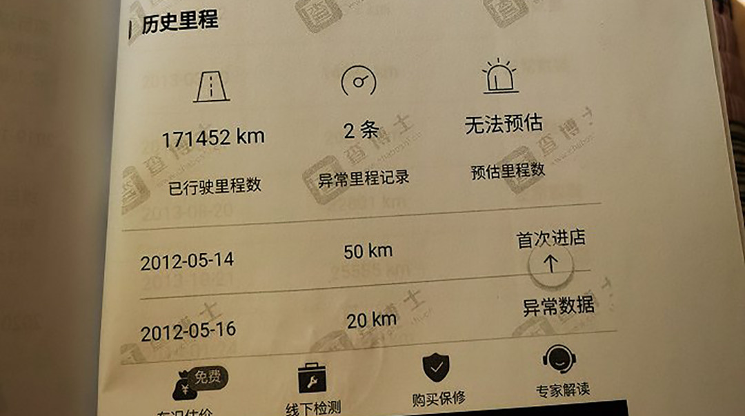 另外让人疑惑的是,新车在出售之前,就私下进行了车辆行驶里程的调整,也就是我们常说的“调表”。2012年5月14日,首次进店则是50km,2天以后里程则神奇地变成了20km。纯进口新车50km的行驶里程,尚属合理范畴,为何4S店要冒险、多花人力进行调表?