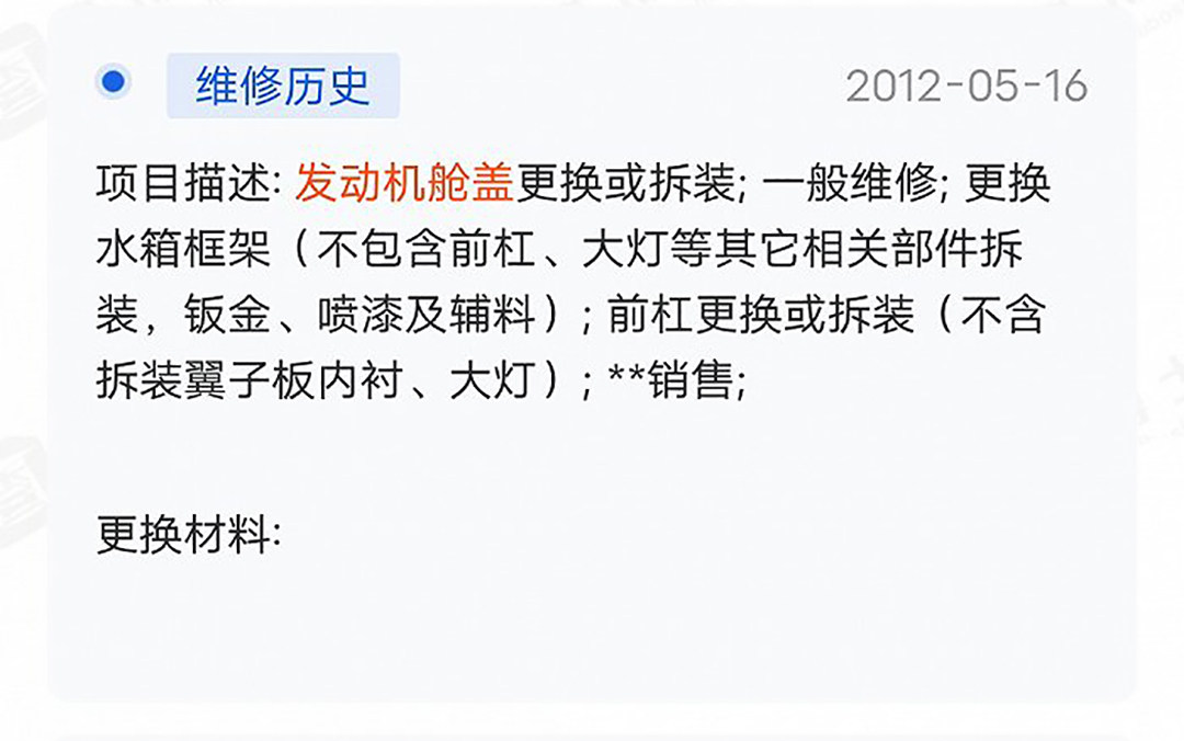 维保记录显示,这款“新车”在2012年5月16日,就进行了发动机舱盖更换、水箱框架更换、前杠更换,这妥妥就是追尾的“必修项目”,并且涉及到水箱框架的更换,意味了事故程度并不小。