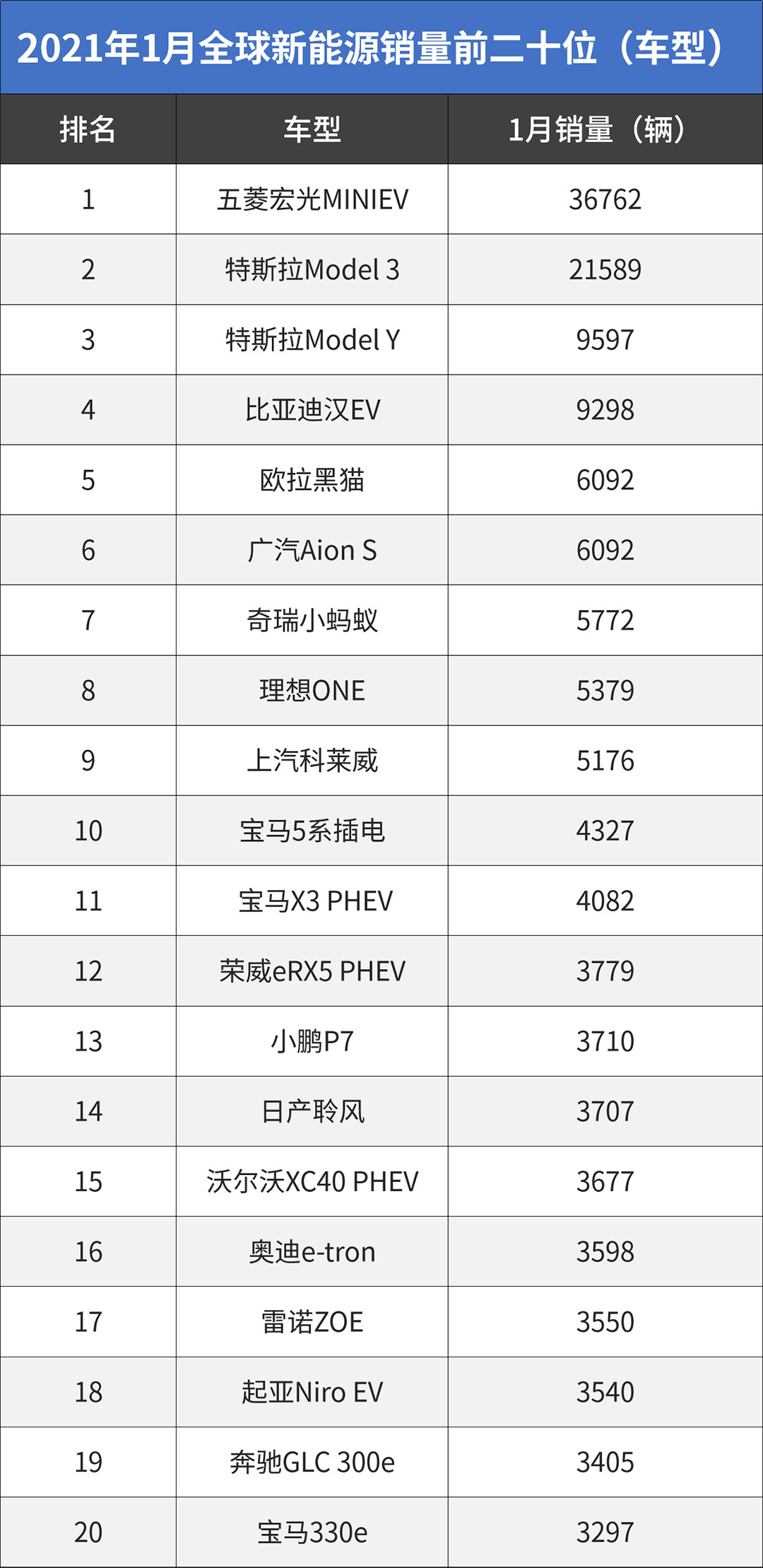 根据国外网站InsideEV统计数据,2021年1月宏光MINIEV拿下创记录的36762辆销量,这也是宏光MINIEV首次击败特斯拉Model 3,问鼎全球新能源月销冠。