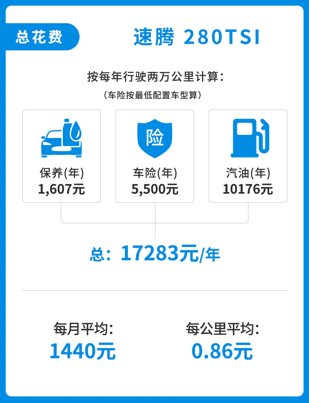 好了,我们小结一下,假如你购买了一台1.4T的速腾,除了前两年每个月的2500元月供之外,平均每个月还得付出1440元左右的用车成本,每公里的行驶费用大约是0.86元。