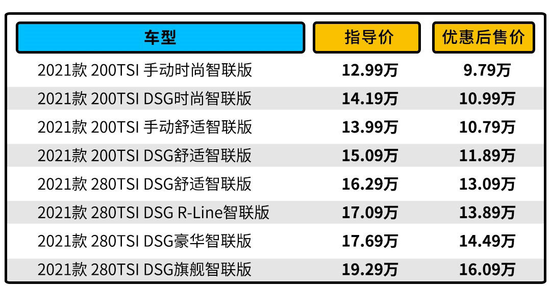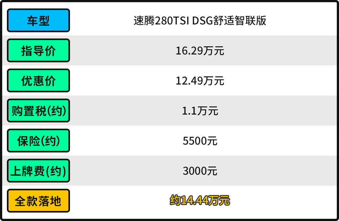 至于落地价方面,以280TSI DSG舒适智联版举例,优惠3.8万元之后(深入交流后的价格),落地也仅为14.44万元左右。