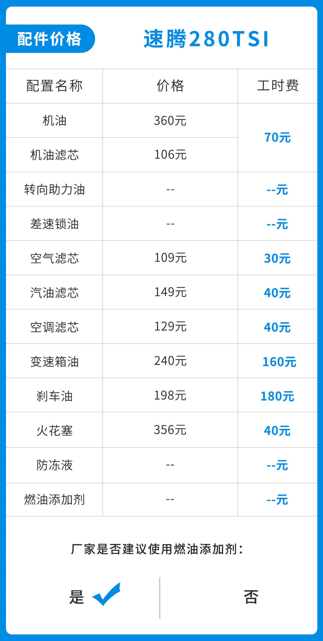 原因很简单,速腾除首保之外,其余都是1万公里的保养间隔,所以对于配件的要求自然也会高一些。