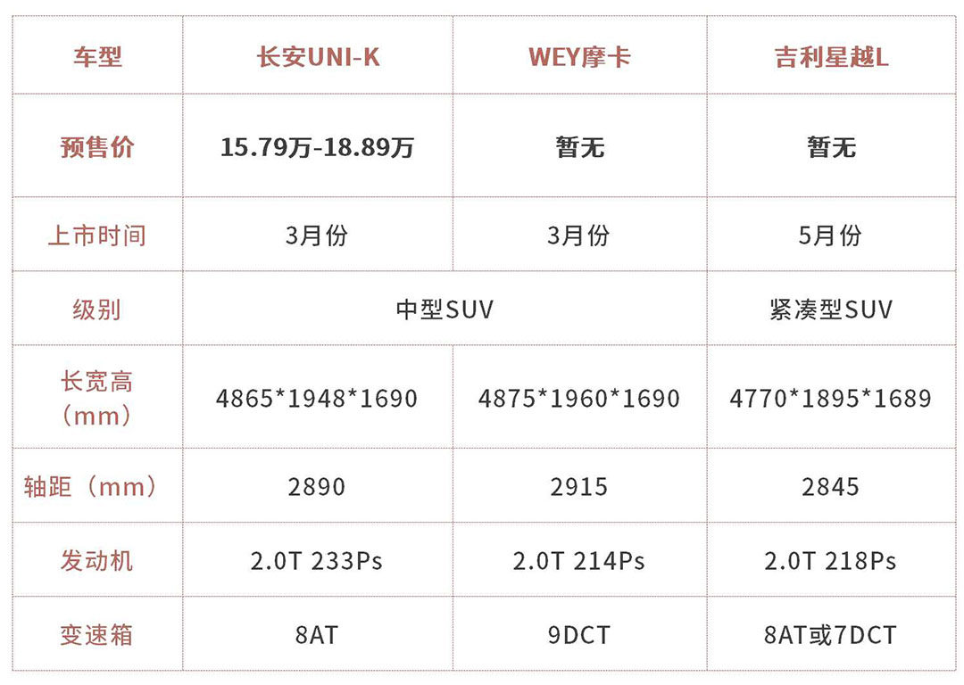 进入到2021年之后,中型SUV将会迎来新一轮的竞争,长安推出最新的产品UNI-K,长城则是有摩卡亮相,并且上市的时间都在3月份。而紧随其后的吉利新车——星越L,看似定位于紧凑型,实则也是中型SUV的尺寸。