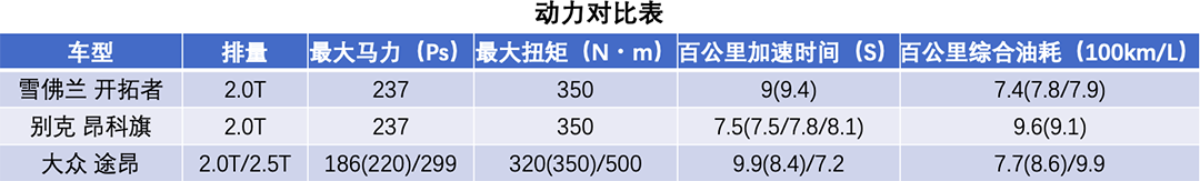 从上表可以看出三款车型均搭载2.0T发动机,而数据来看,2.0T车型中马力和扭矩,是雪佛兰开拓者和别克昂科旗更为优秀。但在2.0T车型中,百公里综合油耗最为优秀的是雪佛兰开拓者,其两驱版的百公里综合油耗仅7.4L,相当节能。