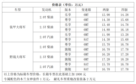 此次上市的车型有装甲大将军、野战大将军、木兰大将军、重炮大将军。值得一提的是,重炮大将军是专门为建党100周年准备的献礼车型,用来见证历史性时刻。另外,应客户使用需求,本次上市新品特对汽油车型增加了手动挡车型,11.98万元起售。值得注意的是,为满足热爱皮卡生活用户的各类改装需求,福田皮卡还推出了垂钓版的山海大将军,房车版的远征大将军以及郊游骑行版的车骑大将军。为了媲美福田大将军的高性价比,福田皮卡同步推出了非常有诚意的金融礼、无忧礼、互联礼、致敬礼、置换礼、爱国礼、贵宾礼,用户购车除可享2年零利息、尽享万元贴息,还可获赠燃油、头等舱式VIP服务,以及核心零部件终身质保等政策。让用户轻松购车,并强化渠道信心,助力销量冲刺。