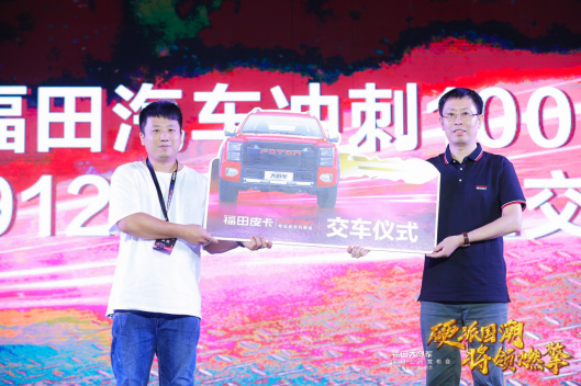 福田汽车集团皮卡事业部党委书记、总裁方宜士向皮卡大叔授予福将驾道00001号会员纪念牌