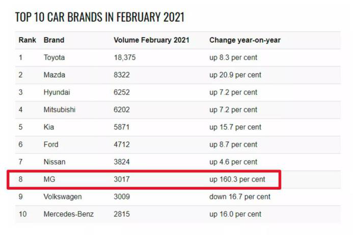 近日,澳大利亚联邦汽车联合会(FCAI)公布的最新销量数据显示,2021年2月,MG在澳大利亚的销量首次突破3000辆大关,达到3017辆,同比大增160.3%,一举夺得销量排行第8的成绩,成为首个进入澳大利亚销量排行前10的中国车企。其实早在2020年,MG在澳大利亚市场的表现就已经非常亮眼,全年销量同比大涨83.2%,在全球化布局上迈出坚实一步。