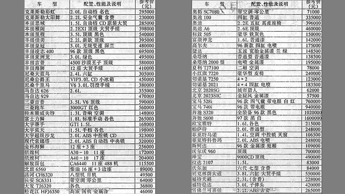 近日教授留意到网上有一张价格表,里面详细展示了1996年北京部分在售车型的价格,据悉1996年北京房价平均在4000元/平方,可见当年能开上汽车的人是多么富裕,而如果用现在的工资作为评判标准,在25年前你又能买上什么车?
