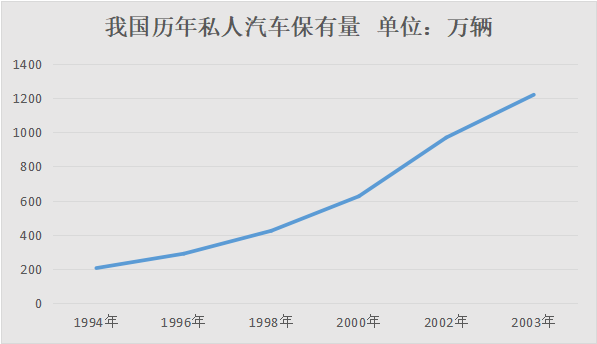 有数据显示,1994年的私人汽车保有量仅有205.42万辆,到了2000年该数值就飙升至625.33万辆,而2002年后就突破了1000万辆,可见增长速度之快。究其原因,大量汽车品牌之间的竞争、汽车制造成本的降低、汽车定位更加入门、道路修建逐步完善以及人民生活生平提高等,都是促进汽车价格下走,销量上涨的重要因素。