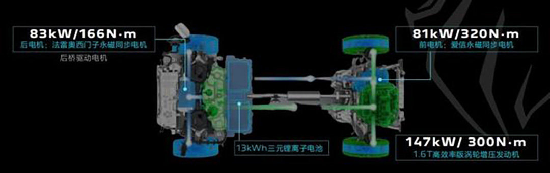 在混动工作模式下,前轴电机主要是在低速时为车辆提供动力,且在变速箱需要换挡时介入工作,让车辆在换代时动力输出更为平顺。而后轴电机主要在四驱模式下为车辆后轴提供动力,以形成四轮驱动的效果,让车辆在通过非铺装路面时更显从容。另外,该车搭载的电池组为13kWh,满电状态下,纯电续航里程为59km,能满足日常市内通勤。