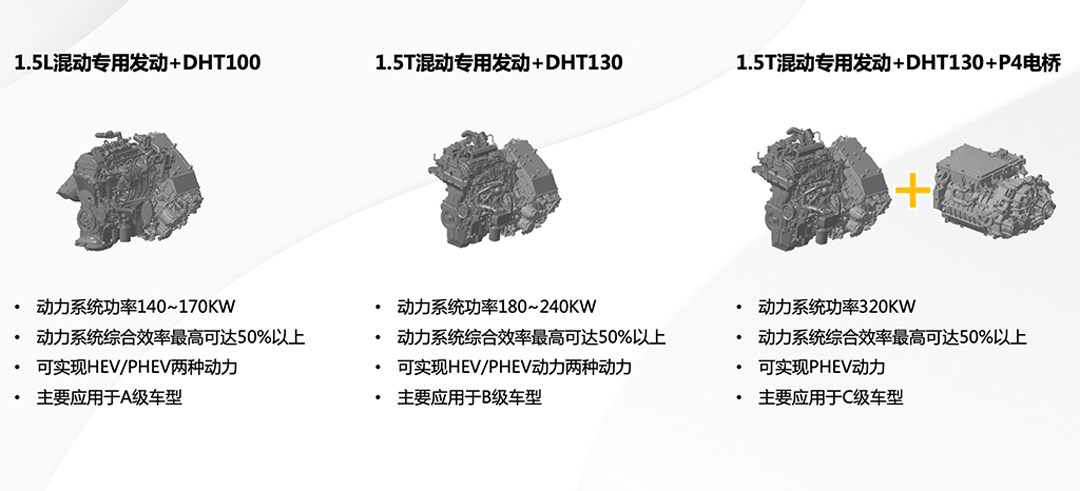从功率大小来划分,DHT平台目前有140-170kW、180-240kW、320kW三套系统,以针对不同级别的车型。