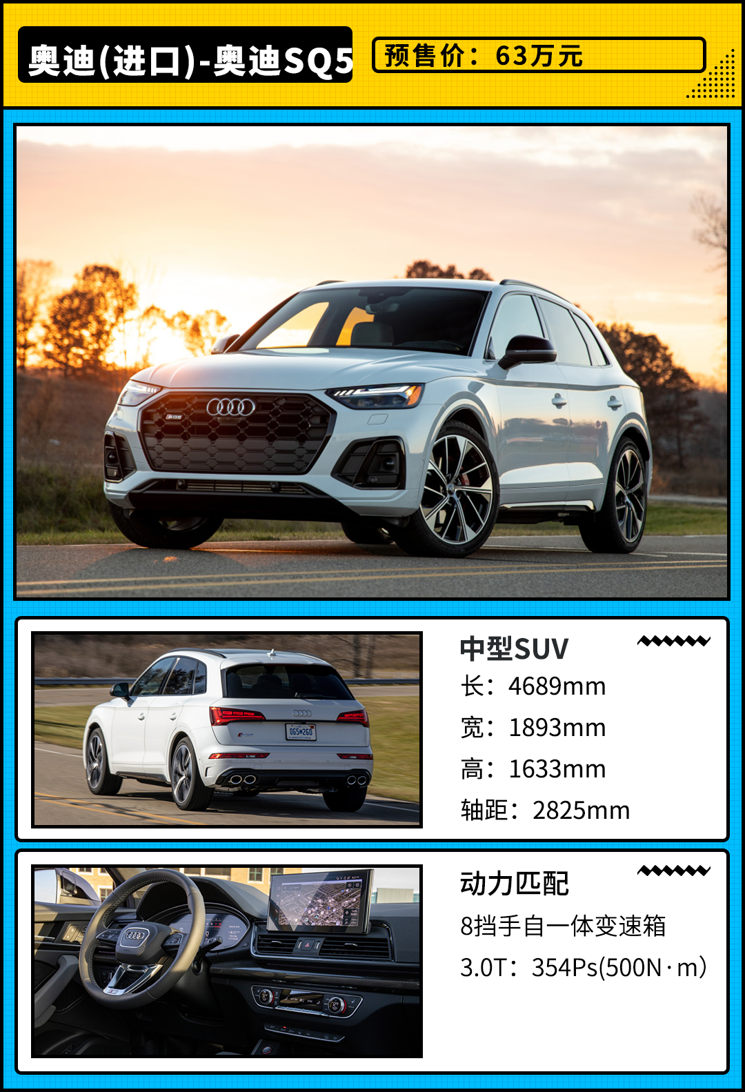 新款奥迪SQ5的引进,无疑是将矛头对准了梅赛德斯-AMG GLC 43系列车型,后者起售价为65.88万元,而此次奥迪SQ5预售价63万元,还是占据小小优势,不过考虑上一代车型售价均为66.8万元,新车正式上市之后可能会做出调整。据悉,新车将在下半年正式发布上市,喜欢的车迷朋友们敬请期待!