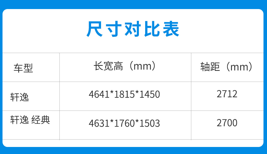 除了造型的不同之外,两款车型在车身尺寸方面的数据也不同。总体而言,轩逸在车身宽度和长度要优于轩逸经典,使其看起来更加的修长。而轩逸经典由于车高加上中庸的设计,则是保留着浓厚的家用车味道。