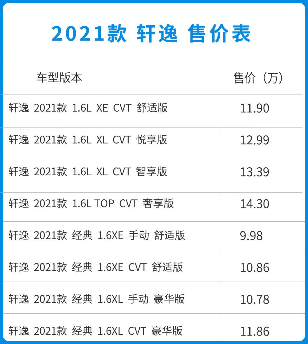最后就是在定价方面,轩逸的整体版本配置定价是要高于轩逸经典的。同样入舒适版本且匹配CVT变速箱,轩逸要比轩逸经典贵上1万左右,而轩逸顶配奢享版就要比经典顶配贵上将近2.5万。