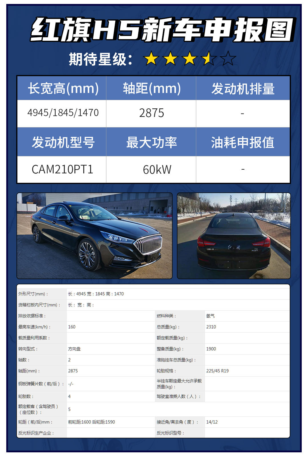 最近几年的红旗势头真是猛,去年圆满达成20万辆的年目标。目前,红旗H5是红旗品牌销量的中流砥柱,继红旗HS5之后第二受欢迎的红旗车型。此次新车申报的是红旗H5的氢燃料版本,驱动燃料较为特殊一些,除了动力上的变化之外,其它方面均没有太大的变化。