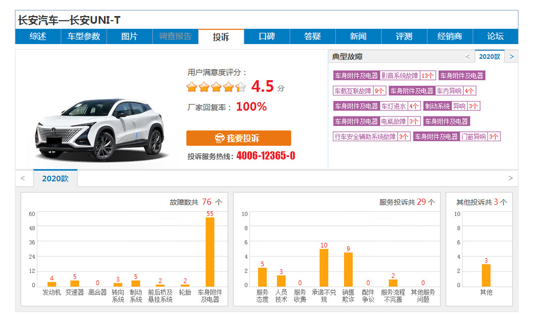 从产品的综合实力出发,UNI-T确实是一款值得推荐的产品,在设计上有特点,技术水准在自主品牌中也算得上优秀。而从车质网的整体口碑来看,设计发动机和变速箱等核心零部件的质量问题并不多,一些反馈大多是车内麦克风、摄像头等电子仪器问题。因此在产品质量方面,UNI-T的表现还是可以放心的。