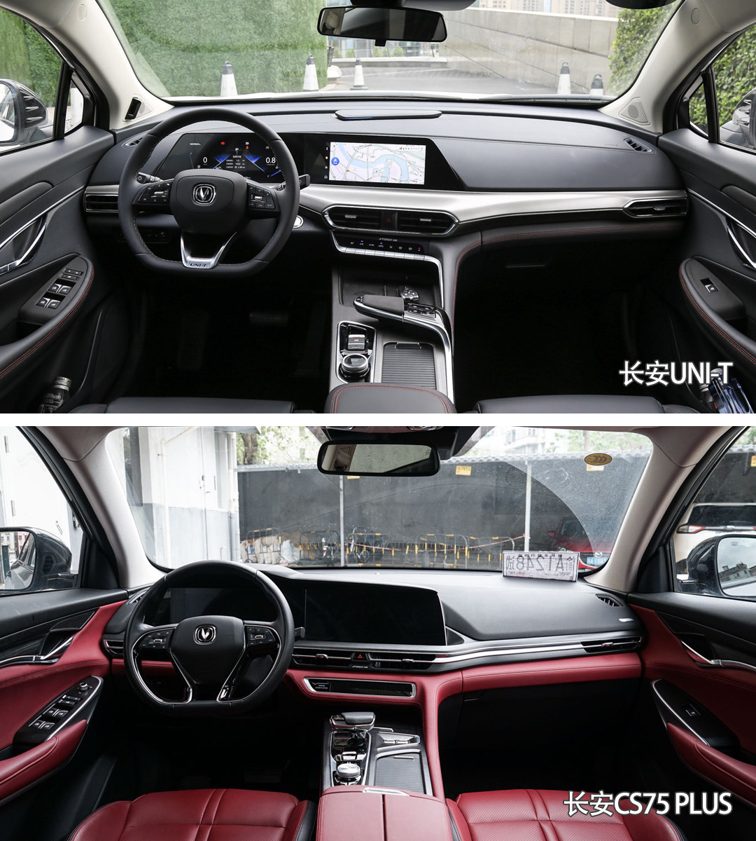 虽然外观设计十分具有特点,但进到车内就会发现,整体内饰和自家其他SUV产品则区别不大,无论是中控屏幕和仪表盘的联屏设计,还是中控区域功能控制区域基本都大同小异。唯一值得一看的,就是UNI-T采用的换挡机构造型,悬浮式的电子档把确实十分突显科技感,同时驾驶模式选择、自动泊车、电子手刹等功能都集成在其旁边,算是车内的一大看点。