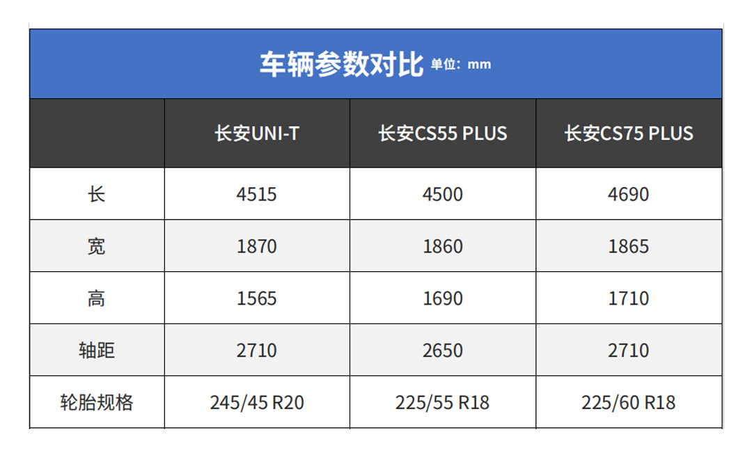 UNI-T的长宽高分别为4515/1870/1565mm,轴距为2710mm。既然是长安旗下的紧凑型SUV,自然少不了与CS75 PLUS和CS55 PLUS进行参数对比。UNI-T在轴距方面与CS75 PLUS相同均为2710mm,不过由于车身长度仅与CS55 PLUS相当,因此在乘坐空间方面UNI-T算是有着不错的水准,但受限于其车长,置物能力并不如CS75 PLUS优秀。但在轮毂方面,UNI-T匹配的轮毂尺寸达到了20英寸,相比两者的18英寸轮毂会显得更为运动也更抓人眼球。