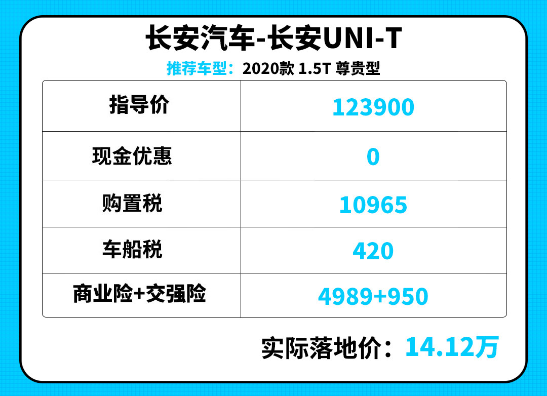 而在售价方面,长安UNI-T上市后一直处于0优惠的状态,虽然11.59-13.39万的售价并不高,但缺少优惠确实比较难刺激消费者购买。以该车主销的1.5T尊贵型(指导价12.39万)为例,算上购置税、商业险等一系列费用后,实际落地价为14.12万元。