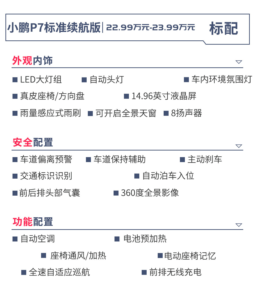 小鹏明显吸取了教训,索性新车的价格不改动,但给了消费者更为丰富的配置。从上图中可看出,标准续航入门版虽然比长续航入门版少了106km续航,但是也多了XPILOT 2.5+自动驾驶辅助系统、前后排头部气囊、手机无线充电、真皮座椅、座椅通风/加热、车内氛围灯等配置。