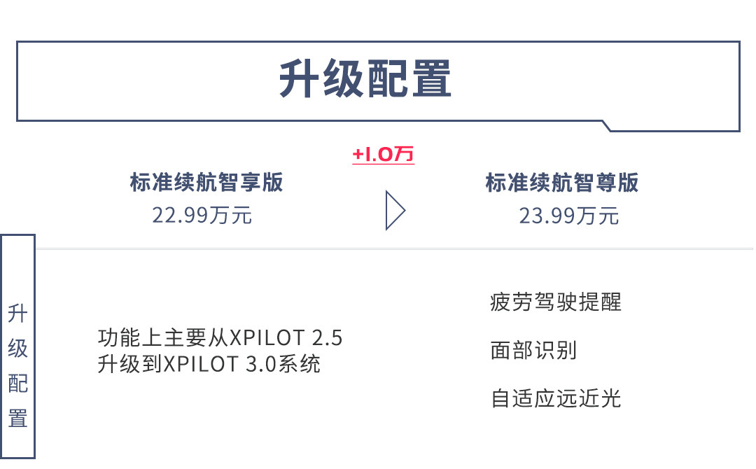 再加一万元可以得到标准续航智尊版,此时升级的配置有XPILOT 3.0自动驾驶辅助系统、自适应远近光灯。标准续航智尊版和长续航智尊版的配置是一样的,而它们因为续航的不同价格相差了2万元。