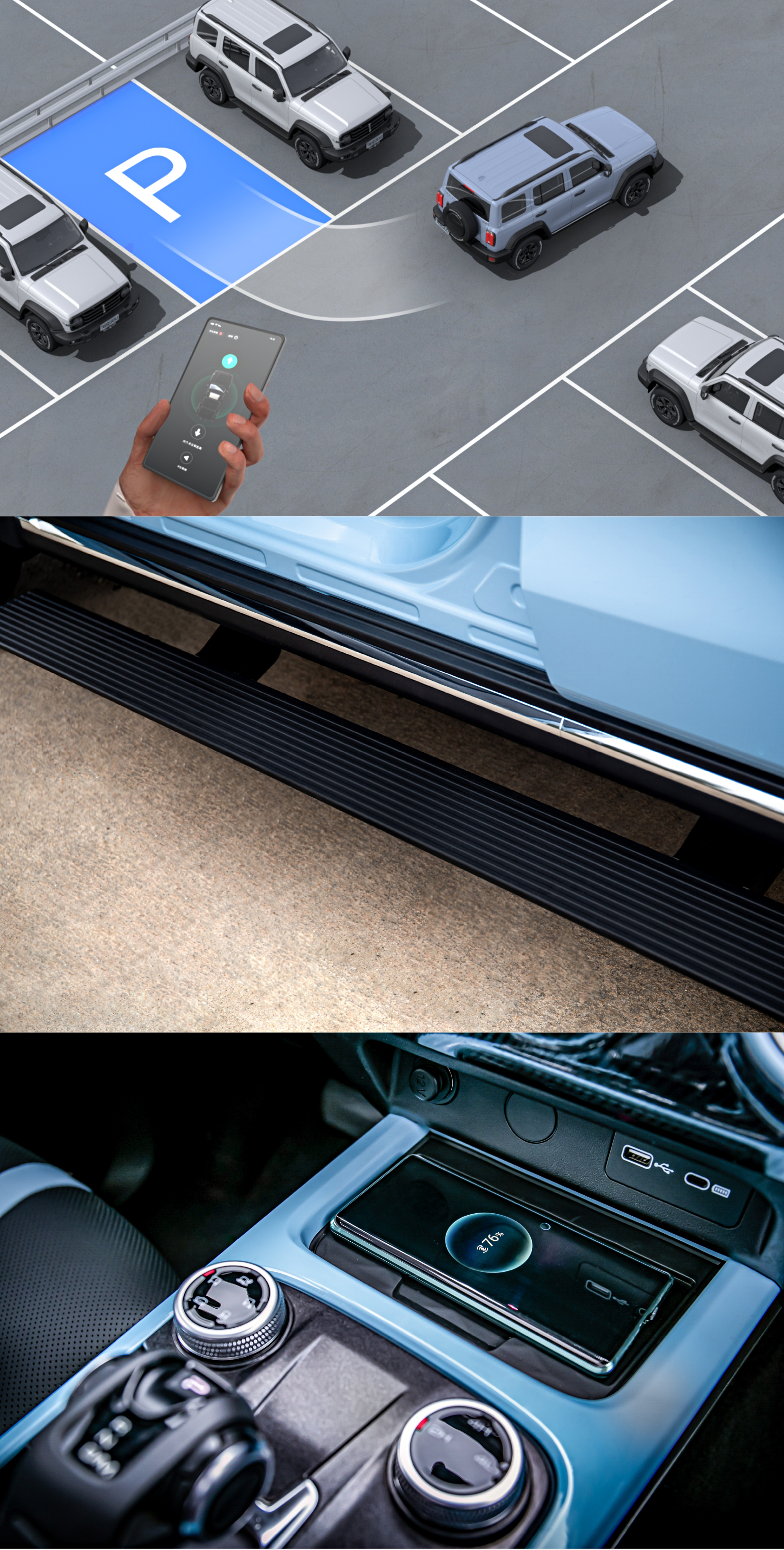 除此之外,坦克300精准洞察时尚群体的智能化、便捷化需求,新增全自动融合泊车、电动侧踏、手机无线充电三大“黑科技”,让用户从上车、在车内、到下车更显科技潮范。全自动融合泊车,可智能识别车位+辨别车后障碍物,让小白秒变车神,还可通过WEY APP“在线”停车,一键解决停车难题。电动侧踏犹如贴身管家,上下车“收放自如”,并附带防夹检测,保障家人安全。手机无线充电,让“手机控”摆脱电量焦虑,随充随走,并附带下车忘记提醒功能,十分贴心。