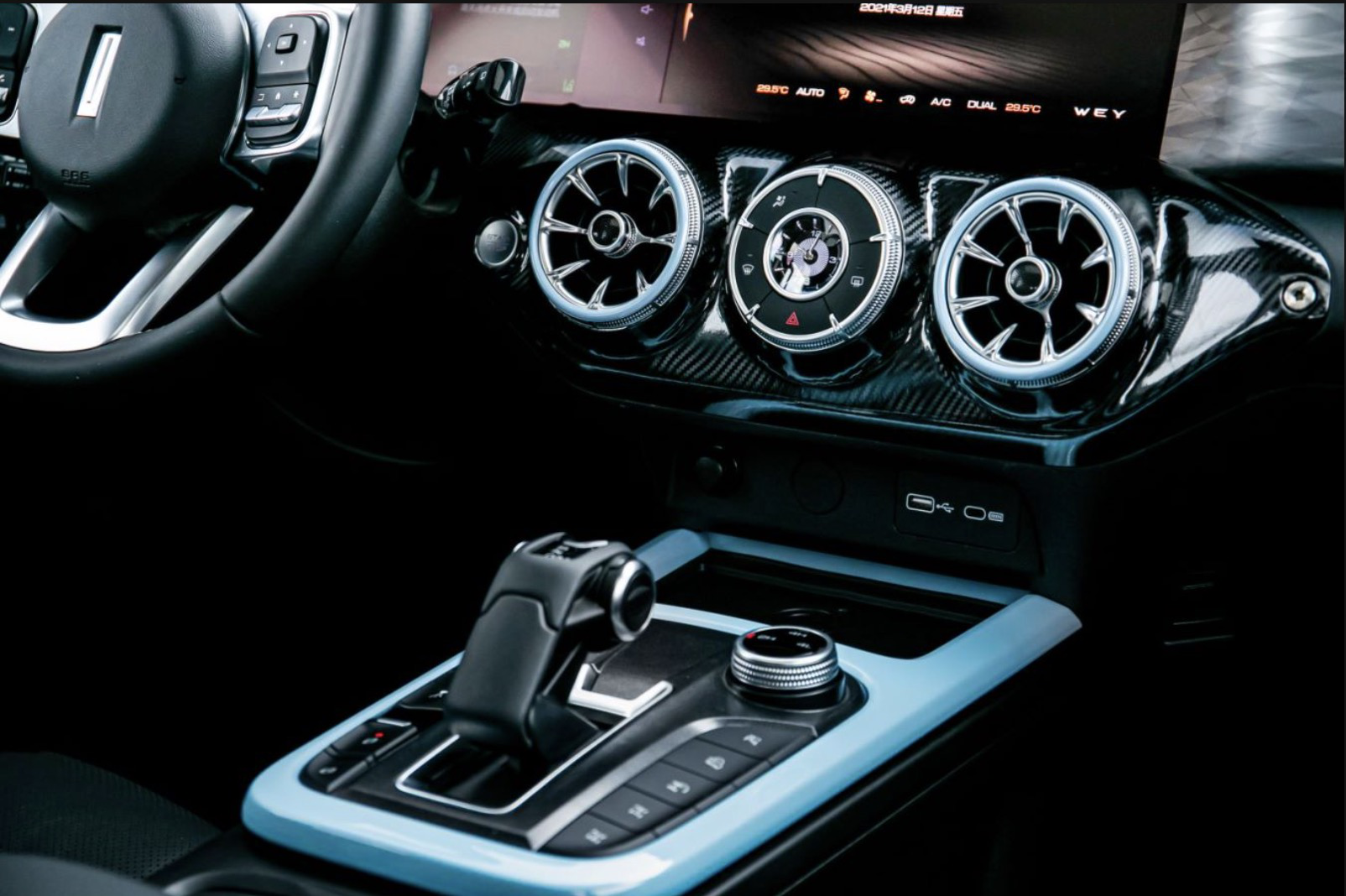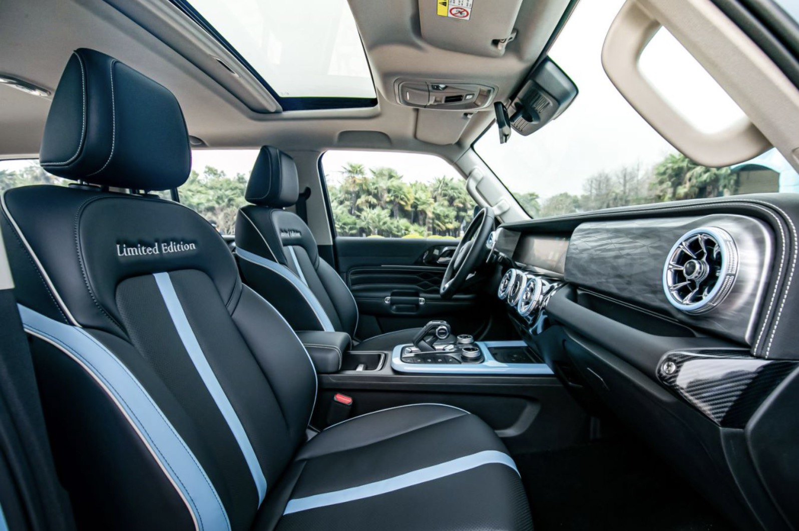 内饰方面,精致感再次提升。黑色座椅运用蓝色几何线条勾勒,拼色设计更显年轻时尚,靠背上面还有限量版专属刺绣徽章,标识鲜明,彰显高定身份感。除此之外,细节依然考究,飞机涡轮式的圆形空调出口、航空推进式档杆、12.3英寸一体式的双联液晶中控大屏等原有配置继续传承,彰显科技质与豪华,为时尚人士带来精致“坦式”生活。