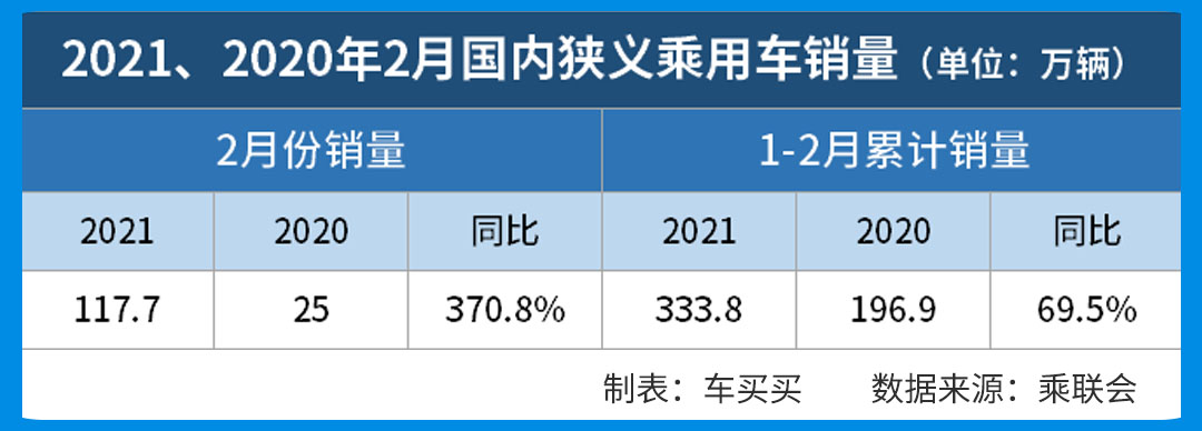 乘联会最新数据显示,2月份,国内狭义乘用车销量为117.7万辆,同比增长371.9%,1-2月份累计销量为333.8万辆,同比增长69.6%。