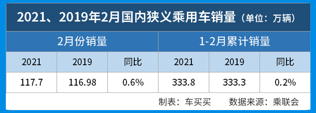 2019年2月国内狭义乘用车销量为116.98万辆,前2月累计销量333.3万;而今年2月销量117.7万辆,累计销量为333.8万辆。整体来看,国内车市已经回归到了2019年的水准。