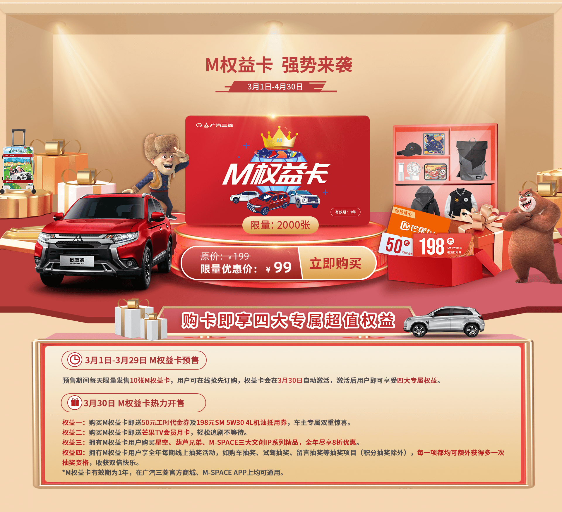 此次,广汽三菱还推出了限时半价秒杀会员M权益卡,可享保养抵用券,视频会员及特权会员折扣,目前限量预售已经开启,3月30日-4月30日将在广汽三菱官方商城及官方M-SPACE APP正式发售。此外,现在购车还可免费获得座舱防霉抗菌空调滤芯,半价尊享价值1776元的广汽三菱恒温等离子空气净化系统,更有低月供、超长贷款期、3年0息等多种金融服务。目前,广汽三菱官方商城还有“菱性”盲盒、积分兑奖等有趣好玩的福利互动,更多惊喜,等你来参与!(详情请咨询当地经销店)