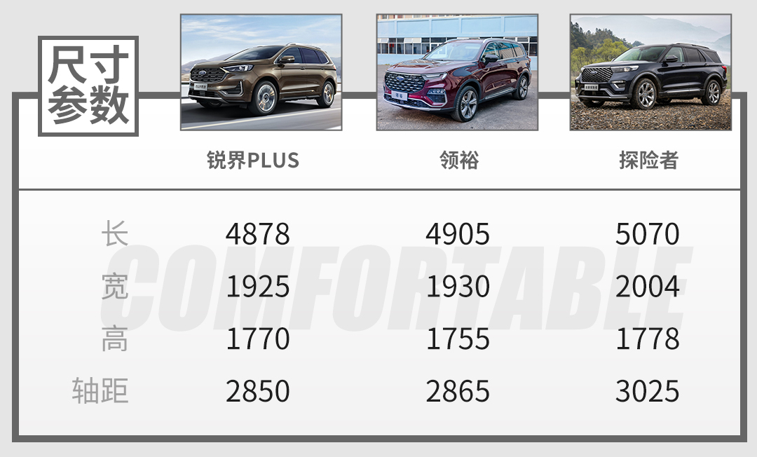 尺寸方面,江铃福特领裕的长宽高分别为4905/1930/1755mm,轴距2865mm,定位入门中大型SUV。假如与长安福特的锐界和探险者相比,领裕的尺寸定位则处于它们之间。