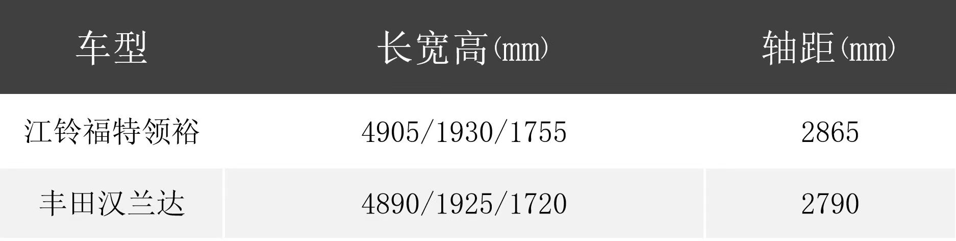 除此之外,福特领裕相比于其他品牌竞争又有什么表现呢?例如市场公认的“不败神话”——丰田汉兰达。首先从车身尺寸来说,领裕的三维数据就比汉兰达大上一圈,而轴距更是多出了75mm。