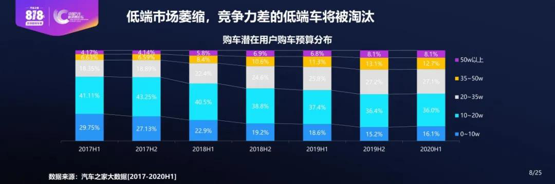 来自汽车之家提供的潜在购车用户购车预算数据来看,10万以下低端市场在逐步萎缩,10-20万中端市场在逐渐壮大,而20万以上的高端市场份额则扩张明显。