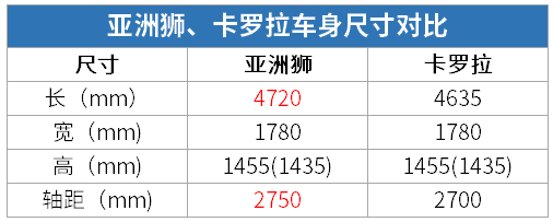 相比卡罗拉轴距增加了50mm,车身宽度和高度与卡罗拉保持一致,所以某种意义上来讲,亚洲狮可以看作是“卡罗拉L”。