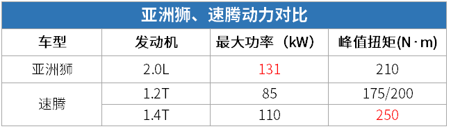 亚洲狮搭载了亚洲龙相同的2.0L自然吸气发动机,最大功率178马力;而速腾则搭载了宝来相同的1.2T和1.4T两种动力,最大功率分别为116马力和150马力。动力方面,亚洲狮更强。