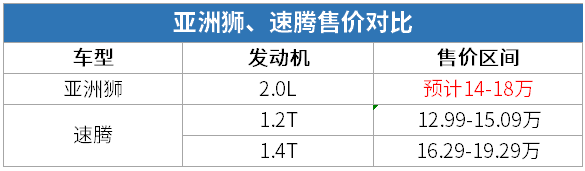 速腾的售价区间为12.99-19.29万元,其中1.4T车型的售价区间为16.29-19.29万。目前亚洲狮只推出2.0L车型,其次低配车型预售价为15.18万元,预计正式售价在14-18万元区间。
