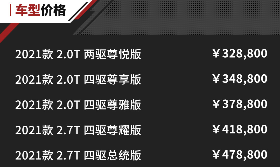 两款动力均搭配8AT变速箱,除了最低配车型以外,其余车型均配备了四驱系统。根据某网站实测的百公里加速时间为6.48s(2.7T车型),百公里油耗为10.4L,对于一台2.7T且如此尺寸的车型来说,这样的成绩已经相当不错。