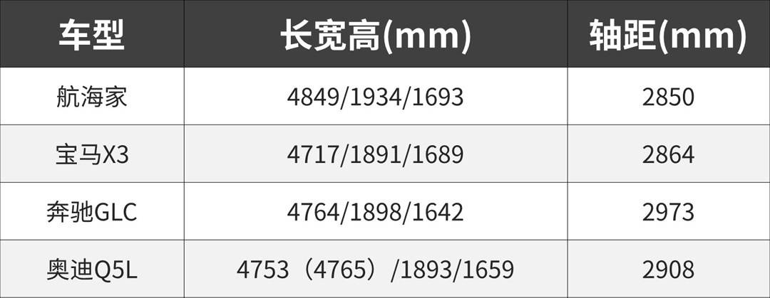 作为豪华品牌中型SUV,航海家最直接的竞争对手莫过于BBA里面的Q5L、GLC和宝马X3,尺寸上来讲,航海家在同级别来说不算最强,轴距相比起GLC和Q5L的车型更显“原装”。