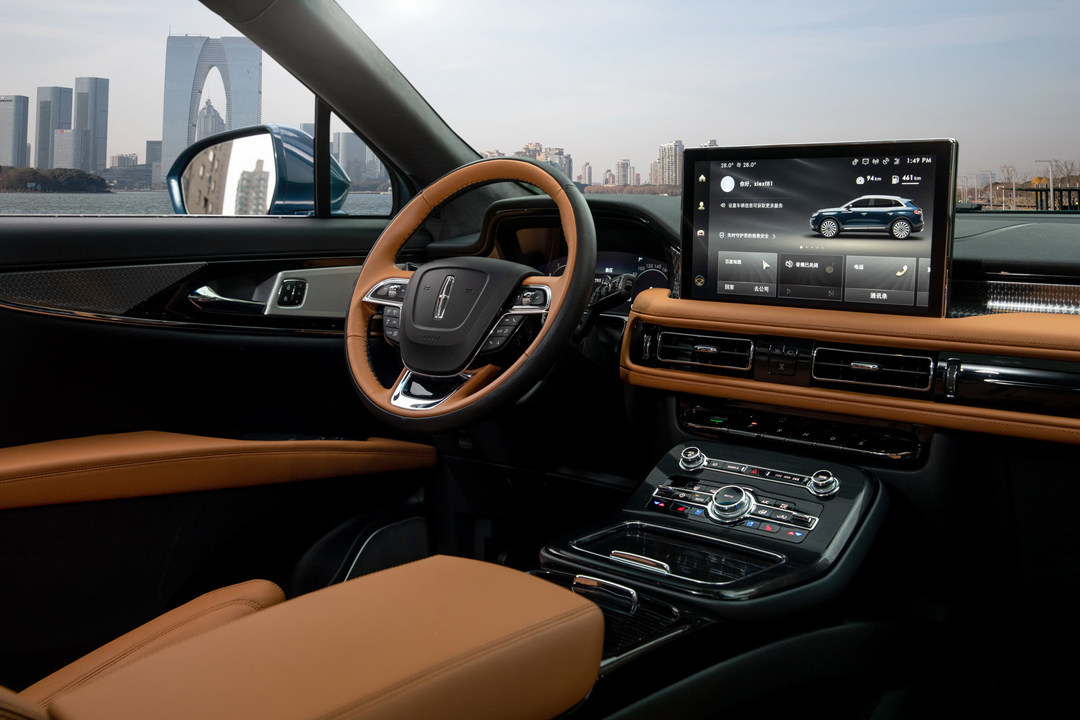 内饰部分,航海家遵循地平线原则,整体设计与飞行家相似,但在方向盘部分带有自己的特色。内饰设计通过皮革以及大范围的镀铬装饰条给人一种老牌美系车的风味,新车依旧保留了林肯一贯的按键式换挡,并且空调面板与其他林肯车型一致,表现出传统美国的质感。