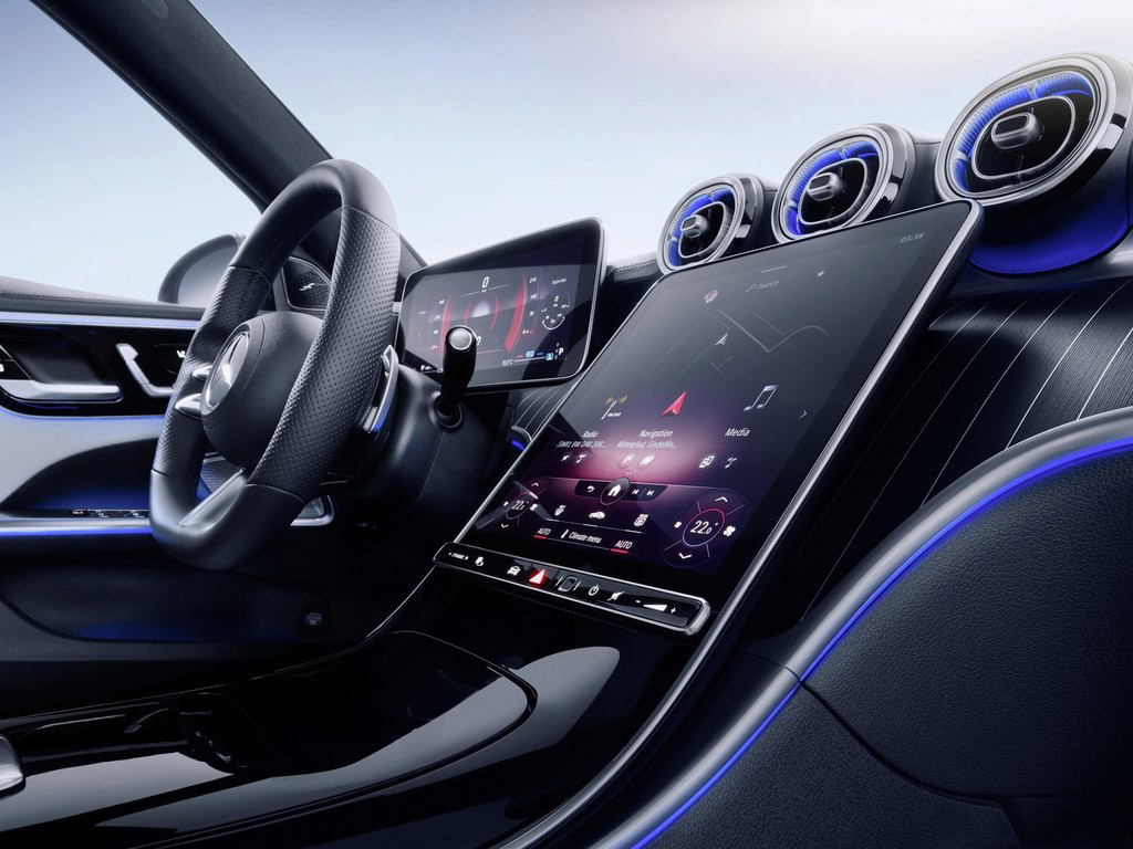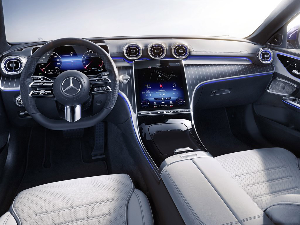 全新奔驰C级在内饰方面延续奔驰S级座舱所营造的前卫科技布局理念,不过中控线条采用圆滑的曲线流向,出自梅赛德斯德国总部前高级设计师杨子墨之手设计的空调出风口也有所不同。全新奔驰C级在内饰的氛围营造上延续了奔驰S级前卫+豪华的氛围,但中控线条与细节部分的调整突显出该有饱满和运动感,不会像奔驰S级那样太过板正。