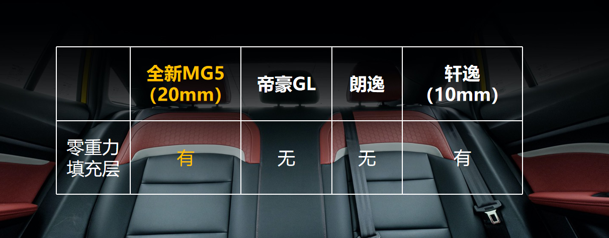 这些填充层能够让人与座椅接触位置(下)重力均匀分布,力不集中在臀部的某一块,自然就不会有受累的感觉。值得一提的是,比MG5价格高的合资车型,如朗逸就没有零重力填充层。号称大沙发的轩逸填充层只有10mm,由此可见MG5座椅的优势。