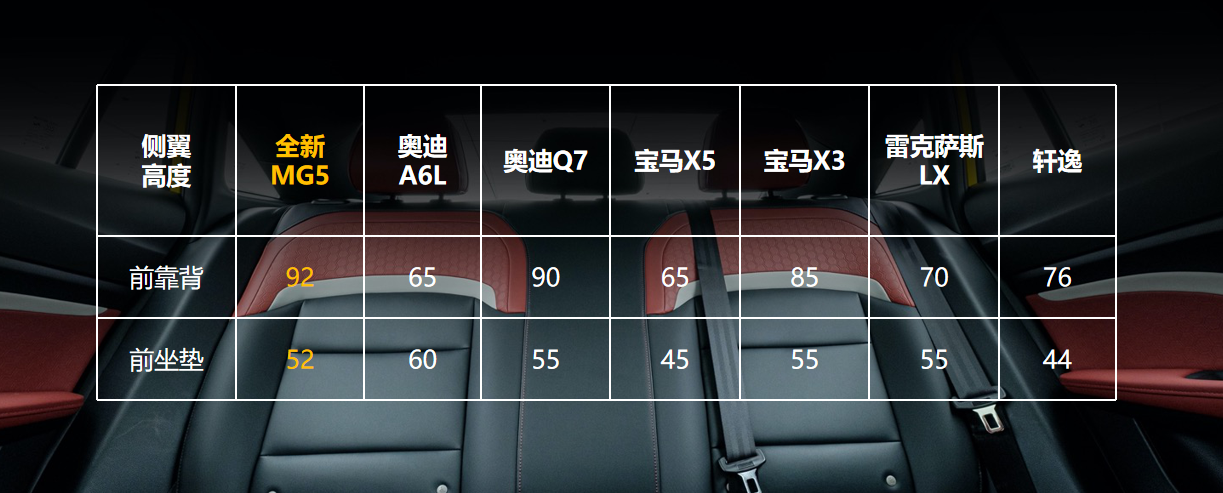 不仅仅是面料柔软,MG5的座椅更是采用了92mm高度的前靠背侧翼,为身体两侧提供均匀贴合支撑。这是什么概念呢?轩逸的侧翼仅为76mm,而以运动著称的宝马X3,侧翼也不过85mm。