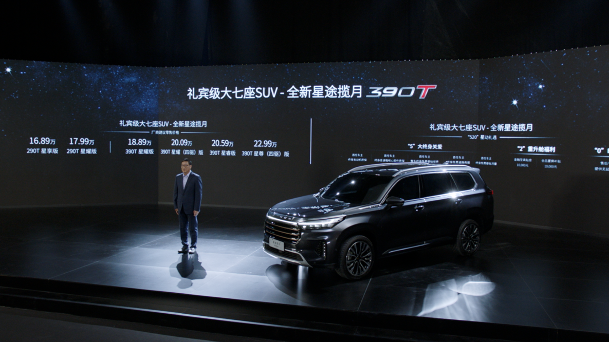 3月18日,备受瞩目的大七座礼宾级SUV星途揽月通过线上直播的方式,正式宣告产品上市,新车售价16.89-22.99万元。本次发布的星途揽月一共有6个版型,分别是搭载了2.0T动力的390T车型,包括星耀版、星耀版(四驱)、星睿版和星尊版(四驱),以及搭载1.6T动力的290T车型,包括星享版和星耀版。