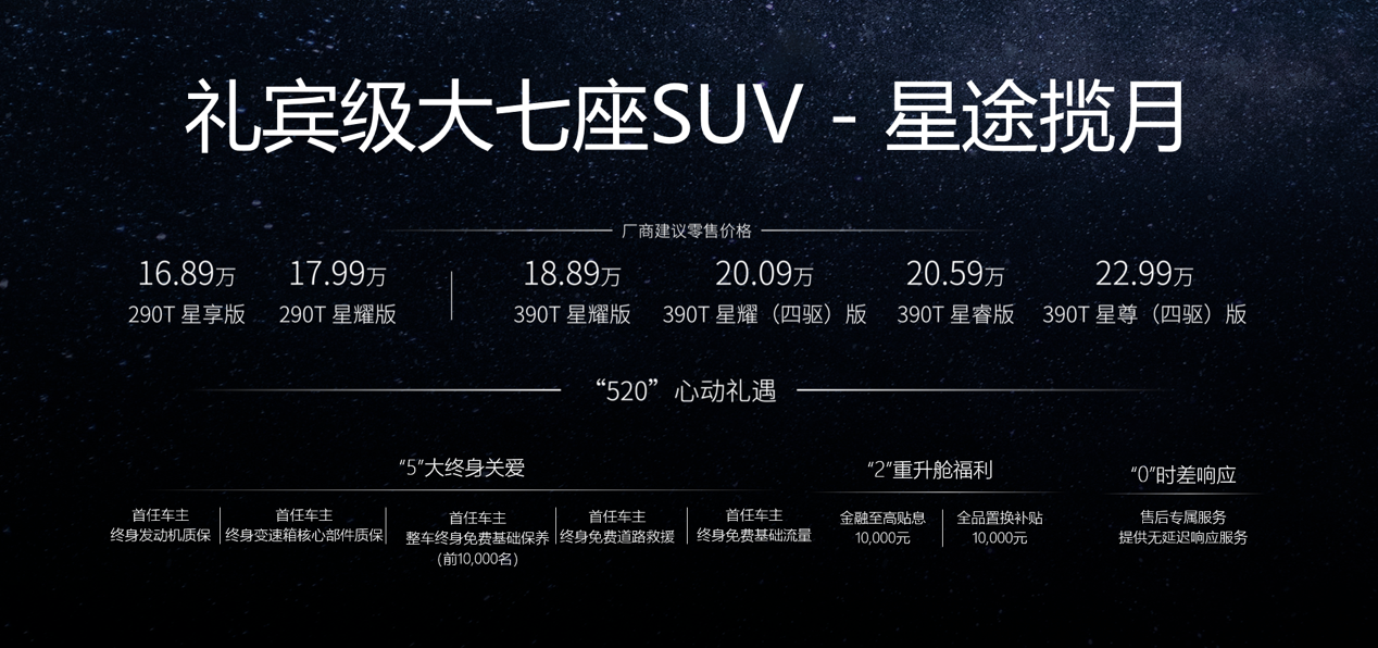 发布会上,星途营销中心常务副总经理叶磊还宣布了用户购车的“520”星动礼遇:首任车主可享5大终身保障,发动机终身质保、变速箱核心零部件终身质保、整车基础保养终身免费、终身免费道路救援以及终身免费基础流量;此外,订购星途揽月可享金融至高贴息10000元和全品置换补贴10000元“2重升舱福利”,更享售后专属服务和无延迟响应服务的“0”时差响应礼遇。