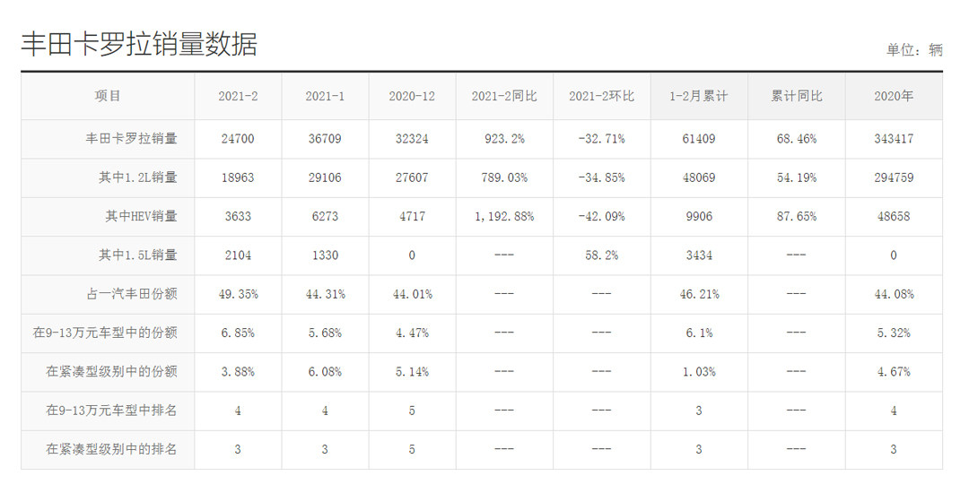 目前卡罗拉1.5L版本已经上市,但从市场表现来看,大多数消费者对这款新动力的接受度普遍较低,毕竟1.2T版本技术相对成熟,庞大的保有量也为后期维护保养省去很多烦心事。而1.5L发动机作为新产品,虽说丰田本身有着不错的口碑,但新技术缺乏市场案例以便观察,后期表现也是个未知数。从2月销量来看,大多数人依旧优先考虑1.2T版本,而1.5L当月仅售出2104辆;倘若后续1.2T停产,不排除卡罗拉的市场销量会迎来骤减的可能。