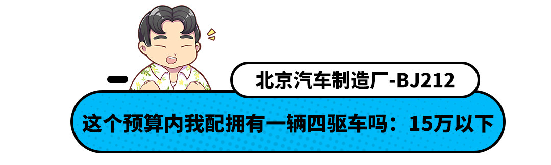 15万以下想买到一款四驱车型?你别说还真的可以。并且该车除了四驱系统外,经典的造型设计也是该车的一大亮点,它就是北汽旗下的BJ212。
