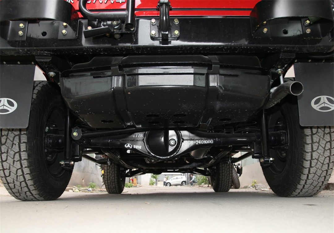 作为曾经的军工技术,底盘方面自然要有过硬的功底。非承载式车身和分时四驱依旧是全系标配,但技术上还是做出了部分提升,原有的前后钢板弹簧整体桥非独立悬挂,更换为前双横臂螺旋弹簧独立悬挂+后螺旋弹簧整体桥非独立悬挂。这项改动大大提升了车辆在公路行驶下的舒适性,同时后螺旋弹簧则增大了悬挂行程,能让车轮尽可能贴地,提高了越野性能。
