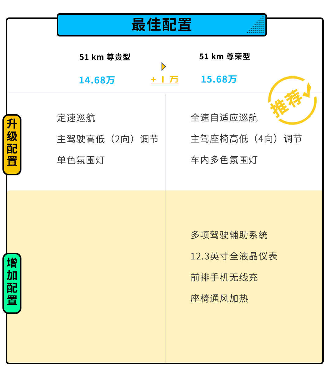 在51km续航版本两款车型之间的定价相差相差一万,但配置的差异体现在多项驾驶辅助系统的配备以及全自适应巡航体统的升级。此外,在科技化功能方面,尊荣型相较尊贵型还多出了全液晶仪表、前排无线充、座椅通风加热功能。