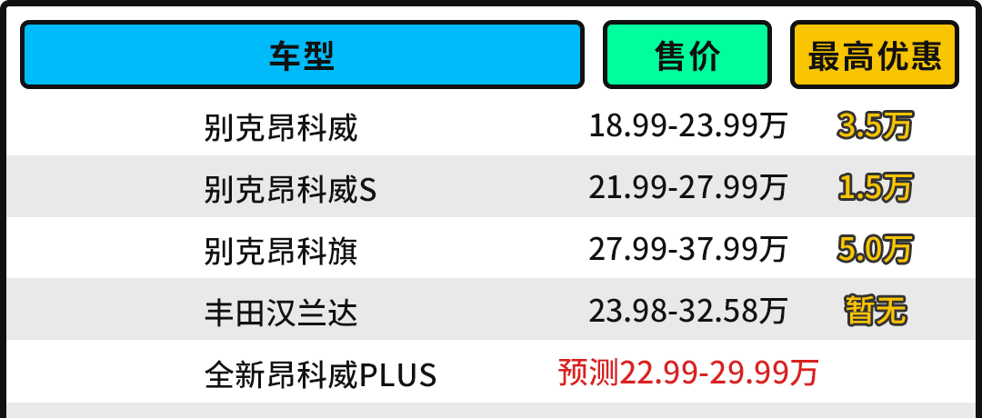当然大家最关心的还是售价,买买君就给大家预测一波,作为参考,目前昂科威S官方指导价区间为21.99-27.99万元,昂科旗官方指导价区间为27.99-37.99万元,汉兰达官方指导价区间为23.98-32.58万元。